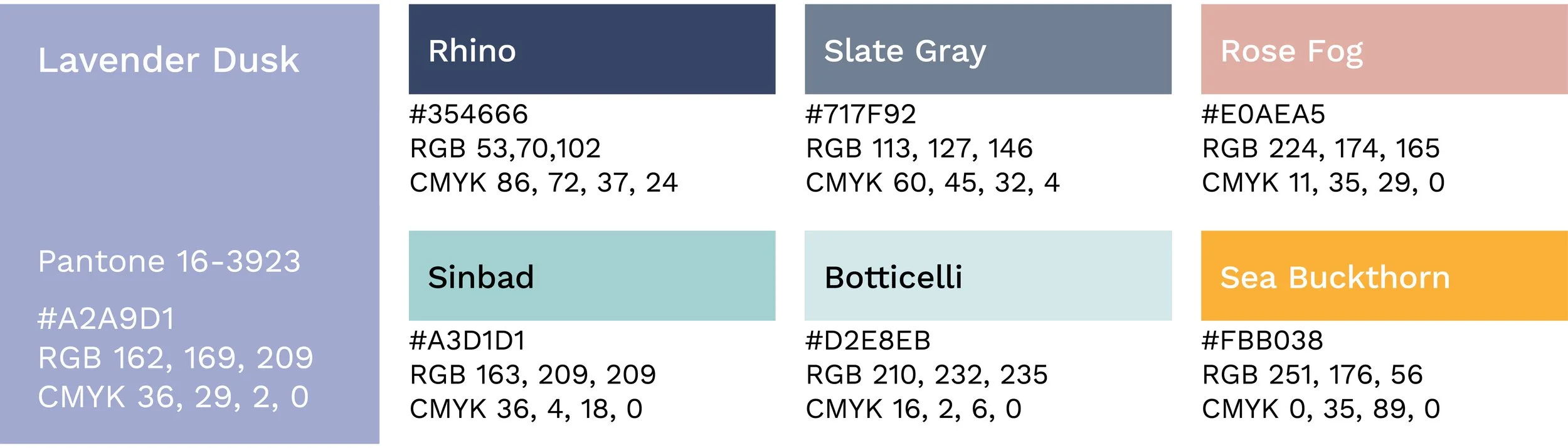 A dusky, ethereal lavender was chosen as the primary brand color. The unexpected shade strategically stands out and amplifies the company’s creative and progressive tone. It’s complimented by six secondary colors to form a versatile brand palette that meets design standards for print and web.