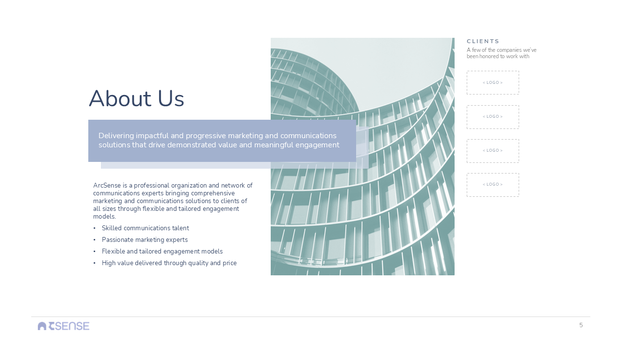 Before its official launch as a full-service marketing and communications agency, ArcSense Communications needed a visual identity that aligned with their company traits: modern, nimble, and approachable. The branding had to resonate with a diverse client base - from biotech firms to independent musicians - and be able to scale and retain relevance as the company grew.