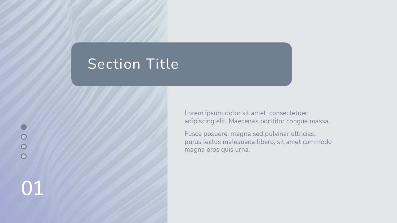 Presentation Template - 16:9 PowerPoint template of 10-15 slides with branded slide master and built-in theme (color palette and typography), comprised of core slides (title, section title, text) + 3 additional layouts with custom graphics, examples, and style guide