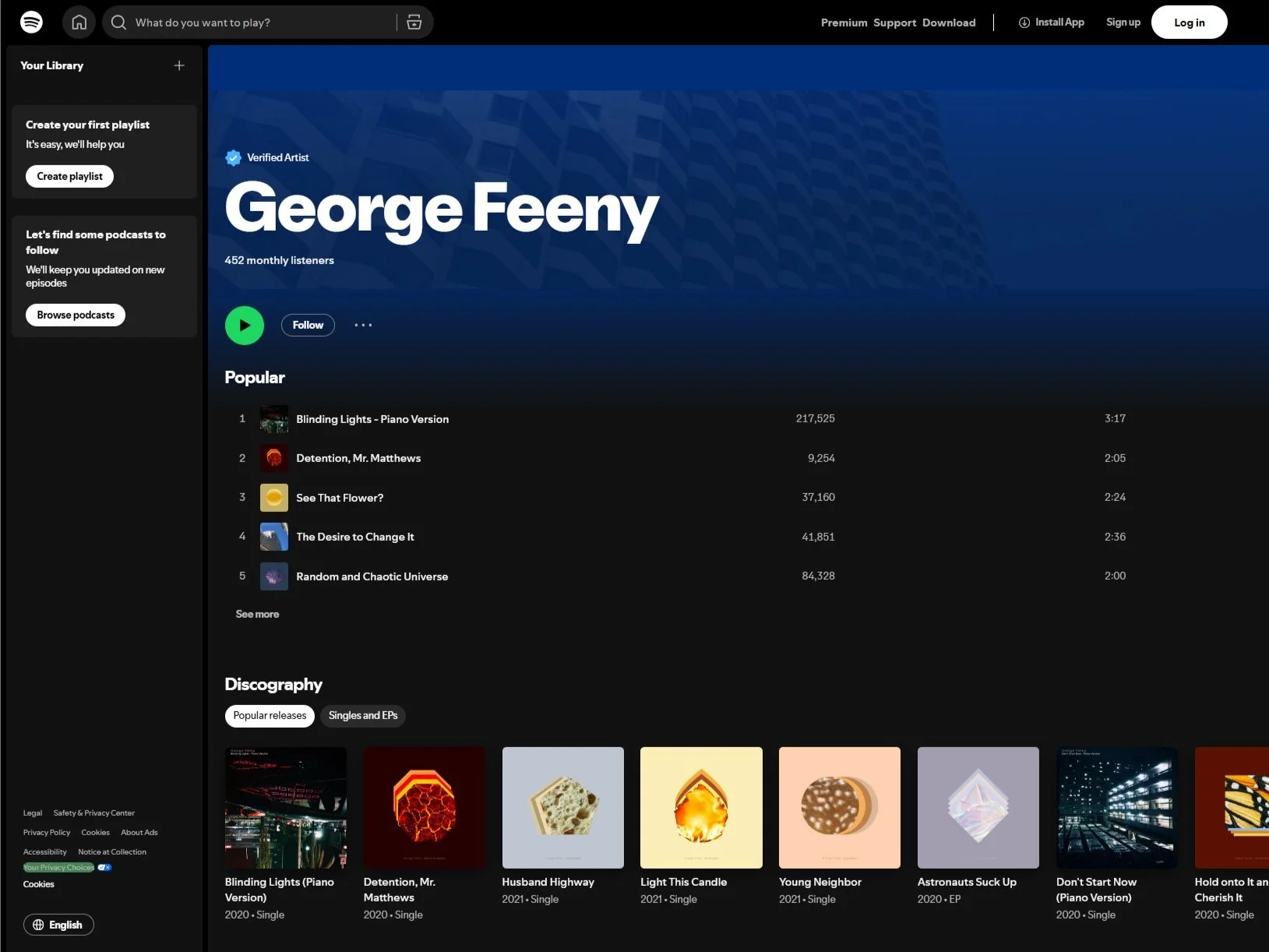 In their first year, George Feeny garnered over one million streams, was featured on official Spotify promotional playlists (e.g., Discover Weekly, Daylist), and appeared on Dua Lipa’s Spotify artist page for their cover of “Don’t Start Now.”